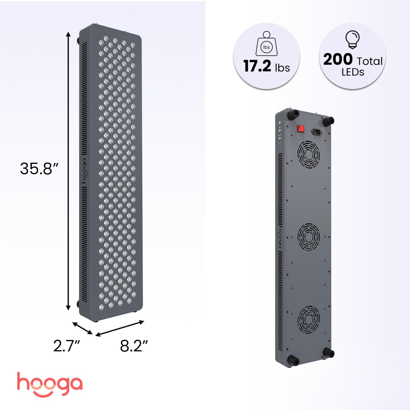 The Hooga HG1000 is a full-body red and near-infrared light therapy panel designed for at-home use. It delivers clinical wavelengths (660nm and 850nm) through 200 high-power LEDs to support skin health, muscle recovery, pain relief, and wound healing. Built-in fans, a timer, and mounting hardware make it practical and easy to use in under 10 minutes per session.