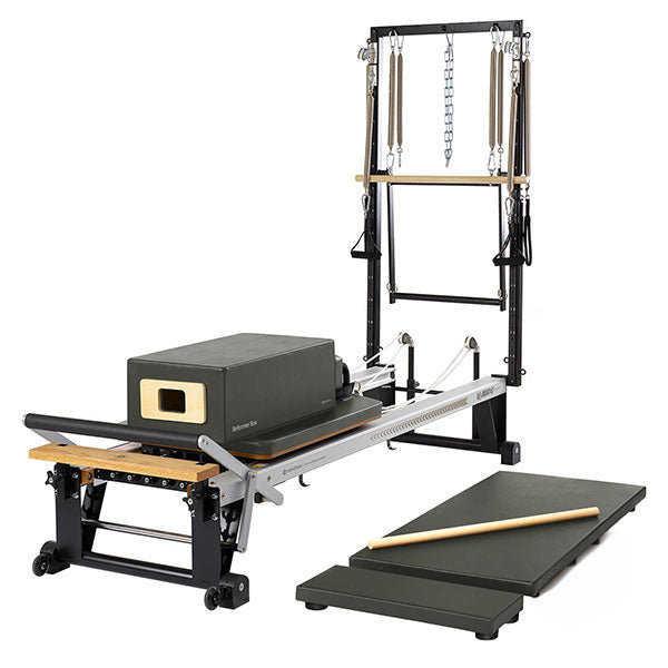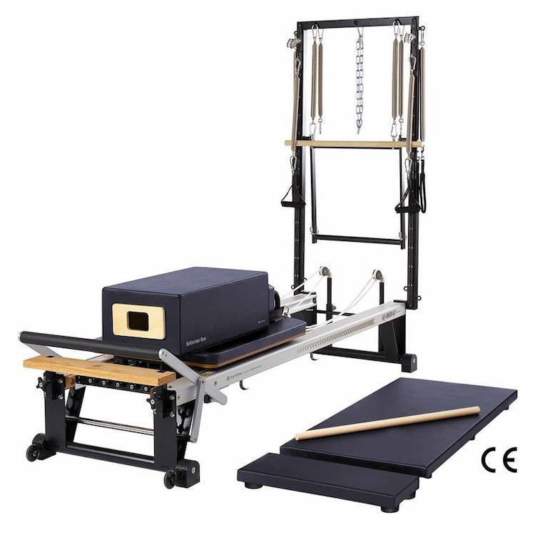 • Included accessories: Vertical Frame, Mat Converter, Reformer Box with footstrap, Padded Platform Extender, Maple Roll-Up Pole, Soft Reformer loops, Carriage Stopper, High-Traction Reformer Feet with Wheels, Easy-roll wheels on both ends
